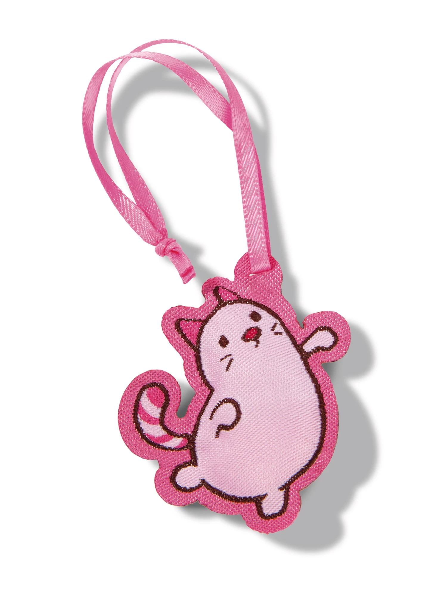 Mit Glitzerbommeln sowie einem passenden abnehmbarem Anhänger.