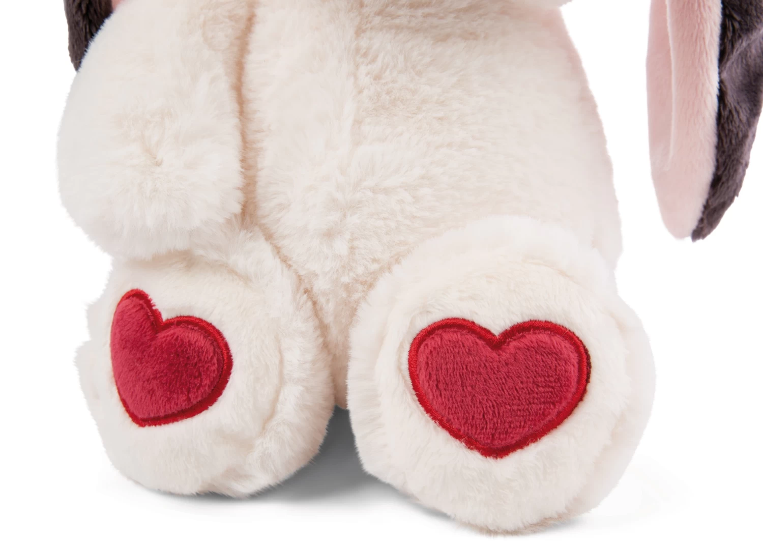 Der Hase ist aus flauschigem Plüsch und hat aufgestickte Herzen an den Fußunterseiten